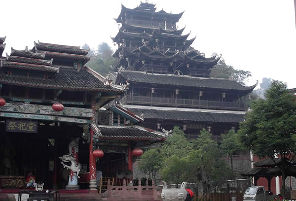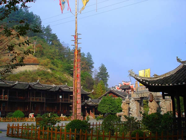 土司城 土司制度初建于五代十國時期,到了明朝己非常成熟了,土司王有無上的權(quán)威,在湘西有三大土司王分別是桑植土司向氏、永順土司王彭氏、慈利土司王張氏,其中又以永順溪州土司彭氏實力最強。其它土司王都為自己修建一座土司城,唯有彭氏分別在永定、永順修建了二座土司城。在永定的土司城內(nèi),彭氏為顯示其地位,修建了湘西最高的一座高達 48米,共12層的吊腳樓,整棟樓竟無一根鐵釘,堪稱土家吊腳樓建筑史上的奇跡,此樓于2002年9月被評為最高吊腳樓,榮獲世界吉尼斯之最,與此同時土司城內(nèi)舉辦一千人參加表演的毛古斯舞蹈活動獲得圓滿成功,同時獲得世界吉尼斯之最。進入土司城,首先看到土司城迎賓儀式,土家漢子迎賓鼓,吹牛角、放沖,土家姑娘攔門歌,敬攔門酒,進入城內(nèi),在祭祀堂前舉行百人土家大祭祖活動,男女老少唱擺手歌、跳擺手舞,登世界最高的吊腳樓九重天,參觀土家族千百年來文化展示。到土家山寨,聽土家歌,賞土家族最有代表風(fēng)俗哭嫁,三棒鼓,花燈等民俗表演。