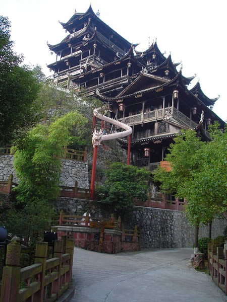 九重天 九重天世襲堂是土家風(fēng)情園的精華和靈魂所在。該建筑由土家民間藝人李宏進設(shè)計,依80度陡坡而建,高48米,共9重12層,整個樓房全部用木栓連接,沒有一顆鐵釘,堪稱土家族建筑史上的奇跡。2002年9 月22日,九重天吊腳樓被載入世界吉尼斯世界紀(jì)錄,認定其為目前中國最大、最高、最完美的木質(zhì)結(jié)構(gòu)吊腳樓。2001年4月6日,朱镕基總理視察土家風(fēng)情園時,對九重天贊不絕口:“一批民間匠人能造出這樣輝煌的吊腳樓,而且還解決了力學(xué)的問題,真是不簡單!鼻迦A大學(xué)著名建筑學(xué)家何重義先生說:“張家界土家風(fēng)情園完全可以和蘇州的園林相媲美。特別是九重天世襲堂,猶如玉宇瓊閣,令人神往!”古人說,天有九野,地有九州,土有九山,山有九寨。古人又把九重叫做天,說天有九重,最上一重是上帝和君主居住的地方,所以我們叫它“九重天”。