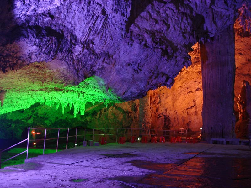 九天洞圖片 九天洞四絕: 第一絕:九天洞大 九天洞總面積250多萬平方米,折合4萬多畝。這樣一個大溶洞,比堪稱世界第一洞的利川溶洞還大3倍。據(jù)《環(huán)球天然奇觀》一書介紹,南斯拉夫的波斯托伊納大巖洞與美國的巴哈馬大藍(lán)洞,都稱為“世界上最大的洞”,還有古巴的貝拉雅馬爾大巖洞與我國貴州、湖北神農(nóng)架一些溶洞,也都被稱為“世界或中國最大的溶洞”。可是這些溶洞,同九天洞比較,都會感到遜色不少。1988年,中國科學(xué)地質(zhì)研究所巖溶與地下水研究室主任張壽越教授兩次來九天洞考察,他認(rèn)為該洞是亞洲第一大洞,于是他給九天洞題詞:“滴石鑄玄女,暗河鏤九天”。1988年9月下旬,來自美國、英國與比利時的15位洞穴專家對九天洞作深入研究,連續(xù)7天7夜住在洞內(nèi)全面考察。通過考察,他們一致認(rèn)為九天洞是世界奇跡,不僅具有很高的旅游價值,同時還有很高的科研價值。