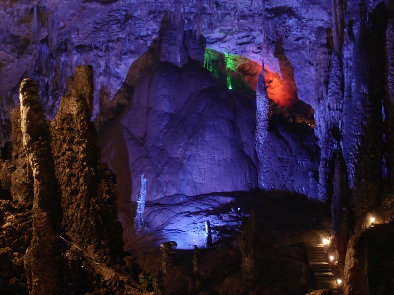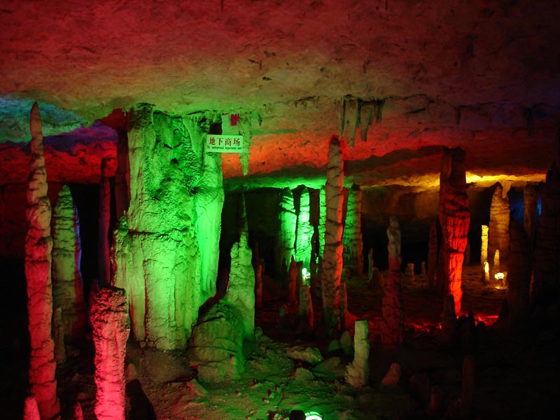 | 九天洞位于湖南張家界市桑植縣城17公里的利福塔鄉(xiāng),距市區(qū)70公里,距武陵源62公里,因洞內(nèi)有九個自然天窗九天洞而得名,總面積250公頃,是中國目前發(fā)現(xiàn)的溶洞之最,比號稱世界第一的利川溶洞大三倍。九天洞內(nèi)空氣清新,冬暖夏凉。整座洞穴分上、中、下三層,有五層不同高度的螺旋式觀景臺,最下層低于地表面400多米。經(jīng)初步探明洞內(nèi)有40個大廳、3條落差懸殊的陰河、12條瀑布、5座自生橋、10余座洞中山,此外,還有不可勝數(shù)的五光十色的鐘乳石群。在眾多迷人的景觀中尤以九星山、玉宮、水晶宮、九天玄女宮、壽星宮五大奇觀最為著名。