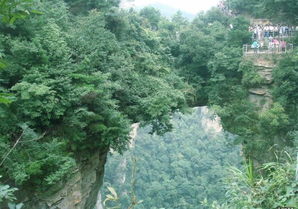 天下第一橋圖片 在砂刀溝盡頭右側(cè),袁家界左面南沿,一天然石橋凌空飛駕于兩座巨大的石峰之巔,厚約4米,寬2米余,跨度約50米,相對(duì)高度400多米。橋面兩端石峰上,綠樹叢簇,郁郁蔥蔥,峰壁則宛若斧劈,草木不生。立橋邊俯視,透過稀疏樹葉,見云涌霧蒸,幽深莫測(cè)。自北端步行過橋,狹窄處僅數(shù)十厘米,心驚卻步。繞過深谷,站在相距40多米處觀橋臺(tái)上,橋的全貌映入眼簾,橋身雄奇?zhèn)グ丁?