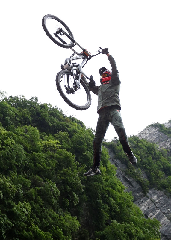 張家界天門山天門洞,999級臺階,以39°斜坡筆直往下,看一眼都覺得眩暈。如果有人騎著山地車一路沖下來,你一定會說“瘋了!”。
