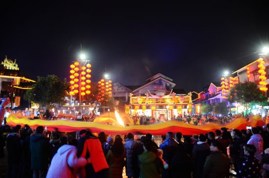 火龍出場,街區(qū)狂舞;盤龍點睛,眾人祈福。12月21日,農(nóng)歷冬至,當(dāng)天夜晚在旅游勝地張家界武陵源區(qū)溪布老街?jǐn)[手堂廣場啟動的 “武陵腔調(diào):趕火趕戲趕大年”活動儀式上,一條全身似火的長龍在近百名土家兒女的舞動下 “閃亮”登場,格外耀眼。據(jù)了解,這條長龍身有香味,全長108米,是目前世界最長的香火龍。