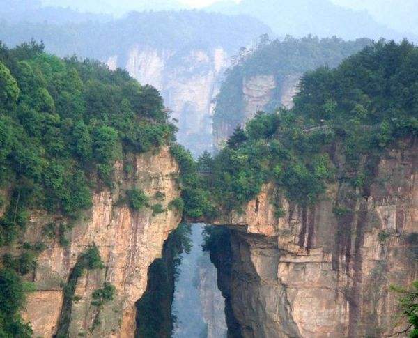 “后花園”至天下第一橋,有一條全長(zhǎng)2000多米的游道,路面多為白色的條石鋪成,站在遠(yuǎn)處觀望,很像一條白色的綢帶打了兩個(gè)結(jié),一頭系在“迷魂臺(tái)”,一頭第在“天下第一橋”。信步漫游,沿途可欣賞到“拜仙臺(tái)”、“百丈絕壁”、“小洞天”、“情人谷”等別有情趣的景點(diǎn),這里海拔不高,一般不受氣候影響,慢慢品味,定會(huì)使您賞心悅目!疤煜碌谝粯颉笔菑埣医纭笆蠼^景”之一。也是袁家界的標(biāo)志性景點(diǎn),它是居于兩山之間形成的一座天然石橋,而兩山原為一體,橋身是兩山相連的關(guān)鍵部分,但因中間石質(zhì)較為薄弱,由于風(fēng)化、崩塌作用的影響,又經(jīng)過(guò)日曬雨淋、流水洗刷、山洪沖擊,久而久之,終于形成今天這一特別的奇景……。自杉刀溝上袁家界,沿絕壁頂部邊緣遨游,至于中坪“觀橋臺(tái)” 遙望千米之外,只見(jiàn)一天然石橋凌空飛架兩峰之巔,氣勢(shì)磅礴,奇?zhèn)ソ^倫,被稱為“天下第一橋”。石橋?qū)拑H3米,厚5米,跨度約50米,相對(duì)高度近400米。天下第一橋與夫妻巖并稱“張家界雙絕”!疤煜碌谝粯颉睒蛎鎸拑擅,厚四米,跨度為二十多米,高度為三百多米,是世界是迄今為止所發(fā)現(xiàn)落差最高的天然石橋。
