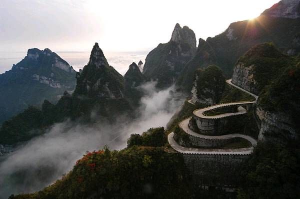 天門(mén)洞以其接地通天的態(tài)勢(shì),成為人們心中通天的門(mén)戶,而通往天門(mén)洞的盤(pán)山公路也因此被稱為“通天大道”。更為神奇的是,在公路竣工的時(shí)候,人們驚奇地發(fā)現(xiàn),這條順山勢(shì)修建的通天大道剛好99個(gè)彎,暗合了“天有九重,云有九霄”之意。 通天大道以進(jìn)山時(shí)的標(biāo)志門(mén)為起點(diǎn),一直通達(dá)天門(mén)洞腳下,全長(zhǎng) 10.77 千米,但就在這么短的距離里,它的海拔卻從 200 米 急劇提升到了 1300 米,大道兩側(cè)絕壁千仞,空谷幽深,180 度的急彎此消而彼,層層疊起,“ 堪稱天下第一公路奇觀 ”。中國(guó)書(shū)法協(xié)會(huì)常務(wù)副會(huì)長(zhǎng)沈鵬先生走過(guò)通天大道后欣然為其題字“曲道通天”,字體遒勁挺拔,與通天大道的奇絕天下相融為一體。通天大道于 1998 年開(kāi)始修建,因天門(mén)山獨(dú)特的地質(zhì)和氣候所局限,至 2005年全面貫通,歷時(shí)8年,共耗資 1 億元人民幣。整個(gè)工程充滿著艱辛卓絕,它凝聚著全體施工人員的智慧和心血,其勢(shì)驚險(xiǎn)奇絕,蕩氣回腸,以蜿蜒迂回穿行于山體絕壁之天險(xiǎn)而成為天下第一公路奇觀。