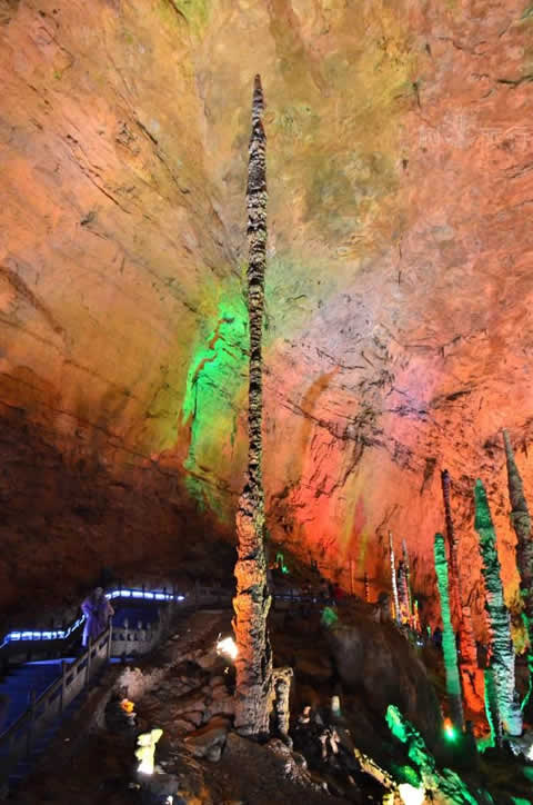 跨過(guò)中國(guó)游覽洞穴中跨度最大的石拱橋天仙橋,便進(jìn)入黃龍洞第三層天柱街了。天柱街是天上的街市,是神仙做生意的地方。天柱街以繁華似錦、春意盎然的“天上街市”為中心,西街花果山石柱石花重重疊疊,東街“天堂宮” 穹形洞頂高大幽深。順著長(zhǎng)長(zhǎng)的崩塌的斜坡往上看,兩根大石柱及壁流石被地下水溶蝕形成了奇妙的空洞,因從不同的地方可以敲出奇妙而悅耳的音符得名“石琴山”。一九八四年,中央電視臺(tái)拍攝電視專題片《地下明珠——黃龍洞》的時(shí)候,就是在這兩根石柱上敲擊出了一曲完整的《賣(mài)報(bào)歌》。